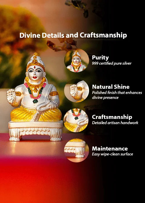 Grace your home with the divine presence of wealth and prosperity through this Antique-Finished Silver Kuber Idol. Finely handcrafted with exquisite detailing, this idol reflects timeless elegance and spiritual charm. The antique silver finish gives it a regal, vintage look, making it not just a symbol of abundance, but also a stunning piece of decor. Perfect for pooja rooms, festive gifting, or simply to elevate your spiritual corner, this Kuber idol blends tradition with aesthetic finesse. Key Features: 🪙 999 Pure Silver Craftsmanship🧾 Certified Purity with Official Document💎 BIS Hallmarked for Guaranteed Authenticity ✨ Antique Silver Finish – Classic design with a rich, vintage appeal 🛕 Symbol of Prosperity – Represents Lord Kuber, the God of Wealth 🖐️ Handcrafted Detailing – Intricately made by skilled artisans 🏡 Ideal for Home Decor & Pooja – Suits temples, shelves, and showcases 🎁 Perfect for Festive Gifting – Great choice for Diwali, housewarmings, or spiritual occasions