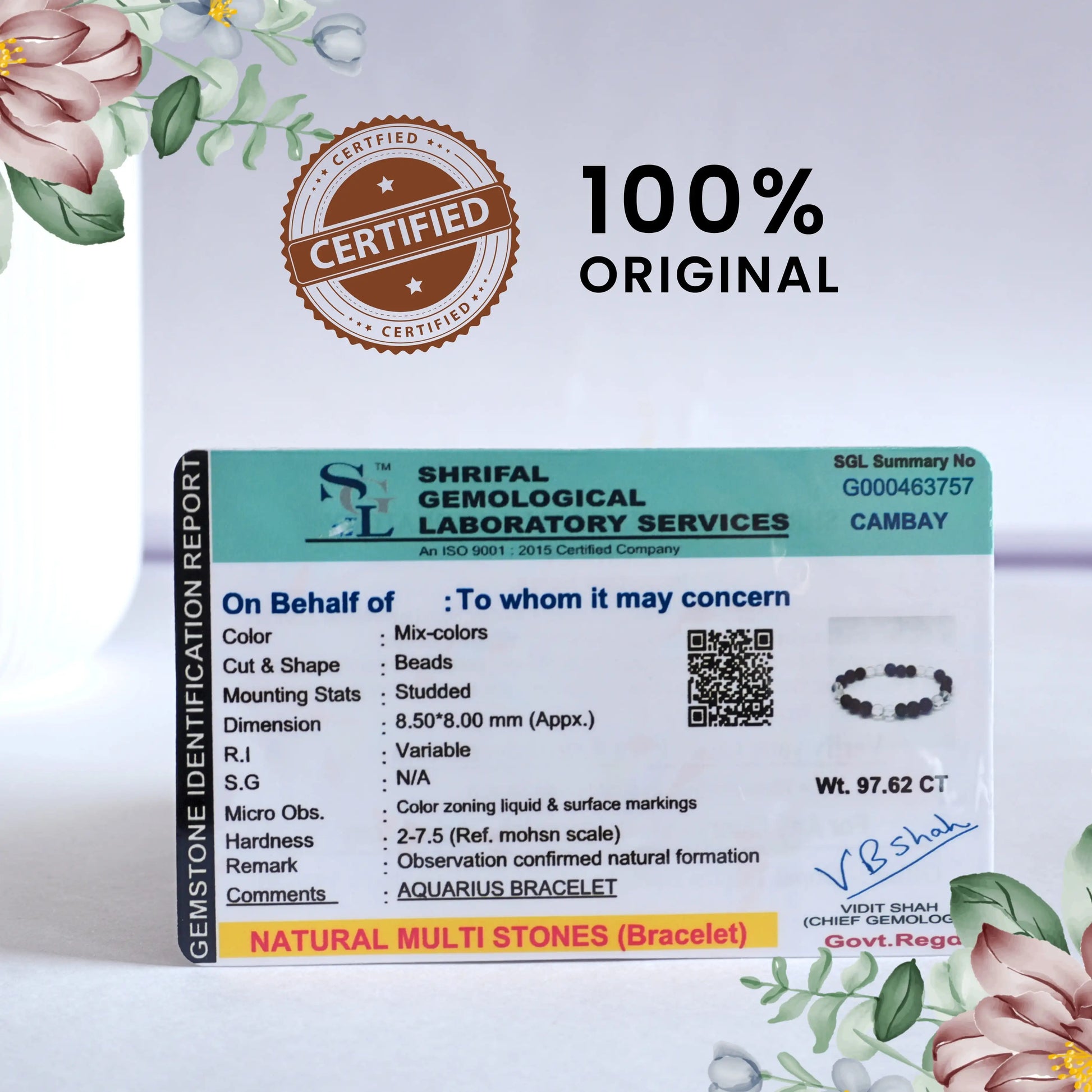 Certified natural multi-stone Aquarius Bracelet with mixed-color gemstone beads. Each bead is approximately 8.50×8.00 mm and studded in a durable setting. Stones exhibit variable refractive index and natural color zoning with surface markings, confirming authentic natural formation. Certified by Shrifal Gemological Laboratory Services (ISO 9001:2015 Certified). Color: Mix-colors Cut & Shape: Beads Mounting: Studded Dimensions: ~8.50×8.00 mm beads Weight: 97.62 ct (approx.) Hardness: 2–7.5 (Mohs scale) Certification: Shrifal Gemological Laboratory Services Special Remark: Natural formation confirmed Category: Gemstone Jewelry → Bracelets