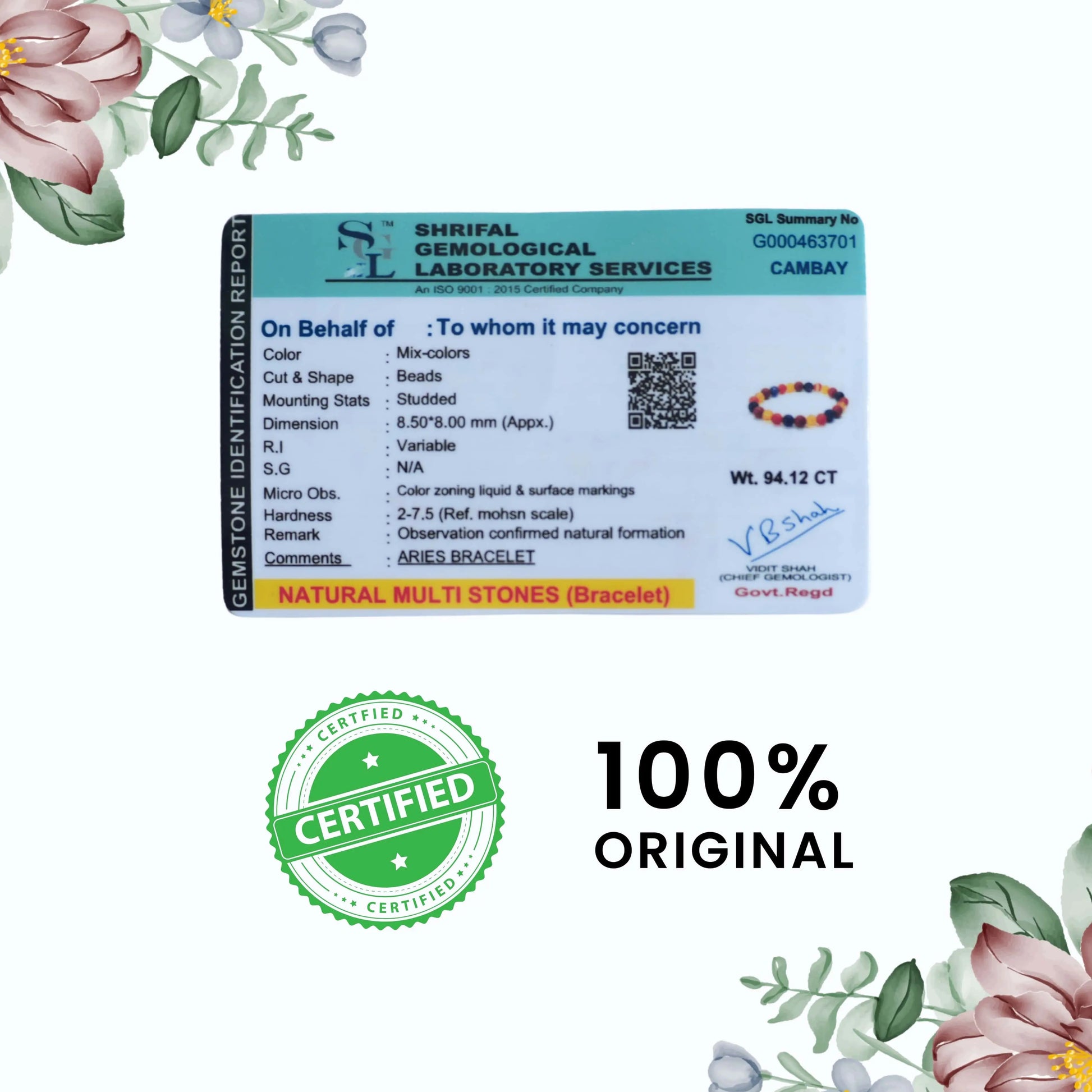 ♈ Aries Natural Multi Stones Bracelet – Certified Bring balance, strength, and positivity into your life with this Aries Bracelet, crafted from 100% natural multi gemstones. Each bead is carefully selected, certified for authenticity, and designed to complement your zodiac energy. 🌟 Benefits: Build Confidence – Encourages self-belief and inner strength Provide Protection – Shields from negative energy and influences Calm Emotions – Promotes peace of mind and emotional stability 💎 Product Details: Gemstones: Natural Multi Stones (Certified) Color: Mix-colors (Red, Yellow, Orange, Black hues) Shape: Round Beads Bead Size: ~8.50 × 8.00 mm Weight: ~94.12 carats Mounting: Studded Bracelet Hardness: 2–7.5 (Mohs Scale) Certification: Shrifal Gemological Laboratory Services (ISO 9001:2015 Certified) Remarks: Natural formation confirmed Zodiac Alignment: Aries ♈ ✔ 100% Original – Comes with gemological certification✔ Suitable for daily wear or gifting✔ Spiritual jewelry with both style & purpose
