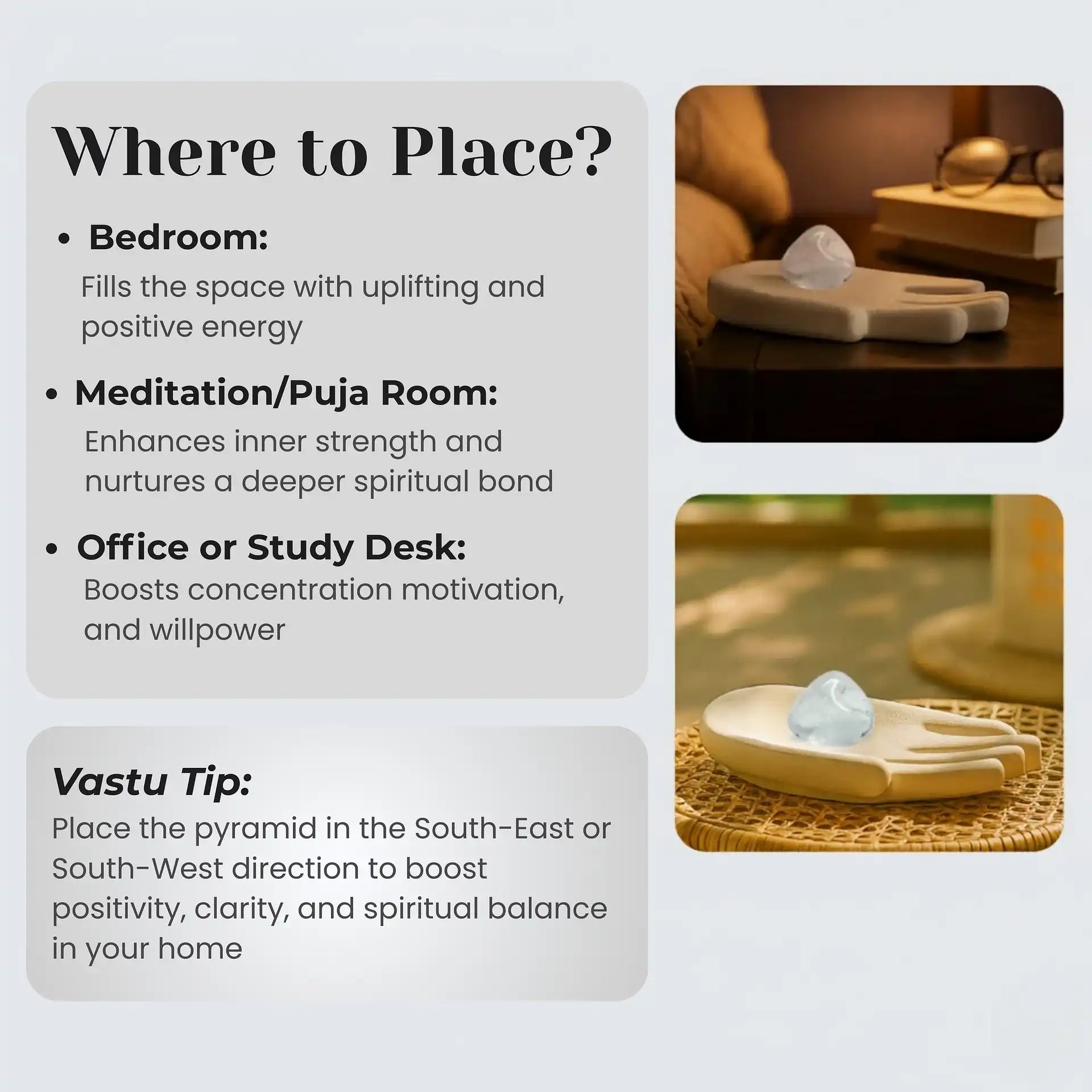 Place or begin using the crystal during Brahma Muhurta (around 4:30–5:30 AM) for maximum spiritual benefits.