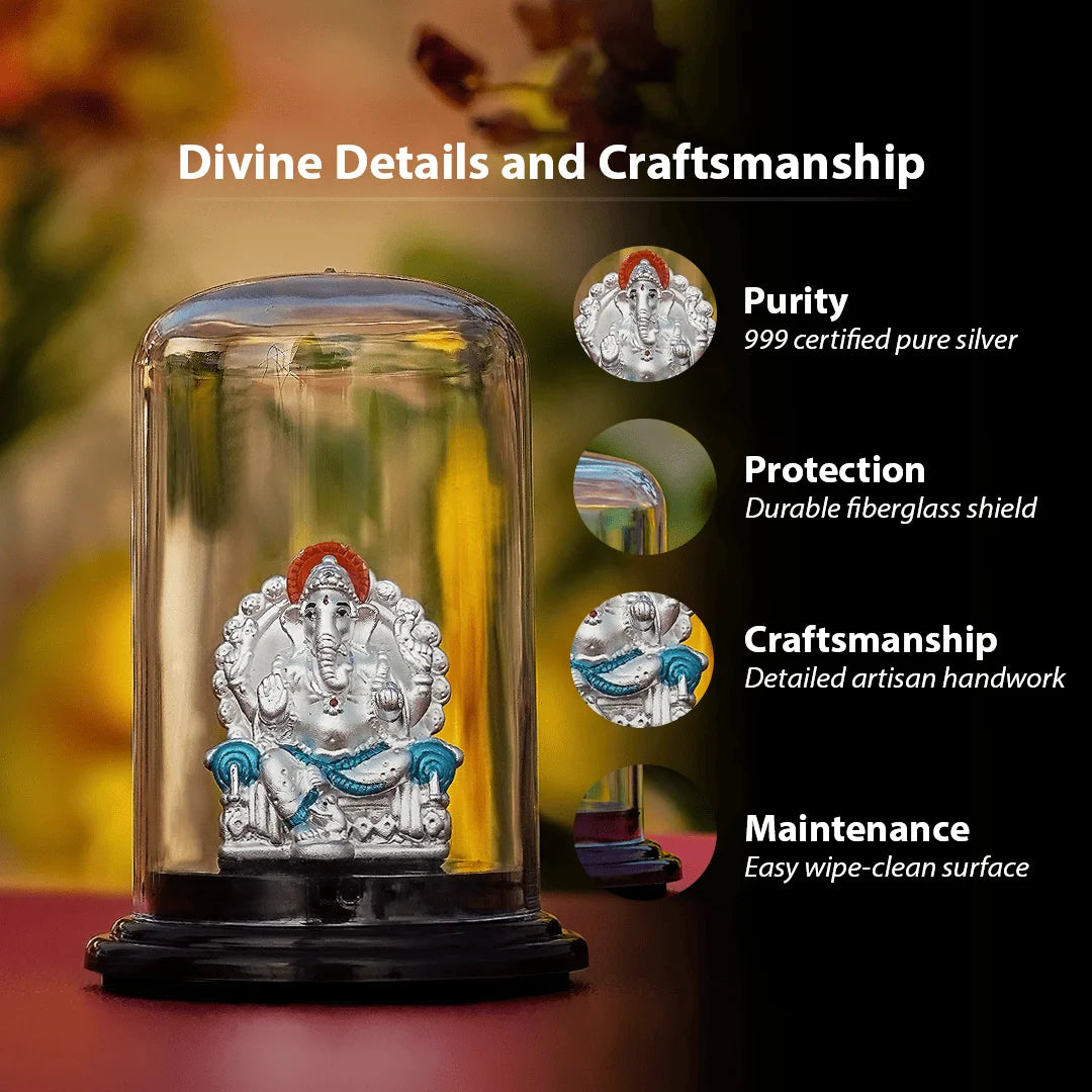 The Divine Silver Ganesh Idol is a masterpiece crafted in 99.9% pure silver, symbolizing wisdom, prosperity, and protection. This exquisitely designed idol of Lord Ganesha is perfect for daily worship, home décor, and gifting on auspicious occasions like Ganesh Chaturthi, weddings, housewarming ceremonies, and business inaugurations. ✨ Features:✅ 999 Pure Silver Craftsmanship ✅ Certified Purity with Official Document ✅ BIS Hallmarked for Guaranteed Authenticity ✅ Handcrafted with intricate detailing✅ Symbolic Representation: Seated Ganpati in a blessing pose, holding modak (sweet), lotus, and axe✅ Brings Positive Energy, Success, and Prosperity✅ Ideal for Home Temple, Office Desk, or Gift✅ Perfect for Festivals like Ganesh Chaturthi and Diwali ✨ Placement & Vastu Tips: Place in the home temple, living room, or office desk for prosperity. Keep in the northeast or east direction for the best positive energy. Avoid placing in bathrooms or directly on the floor. ✨ Care Instructions: Clean with a soft cloth or silver polish. Avoid direct contact with water and harsh chemicals.