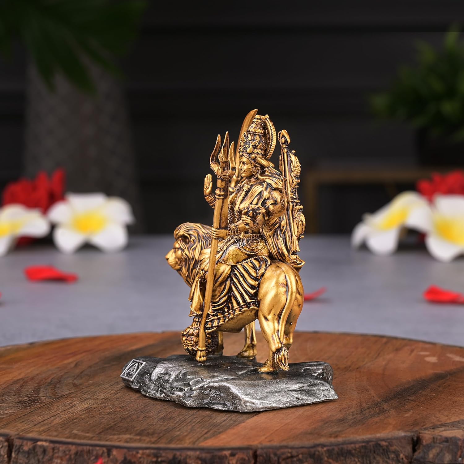 Gold-Plated Shera Wali Mata Idol – 3.9 Inches (Golden Poly Resin) Elegant Design: A beautifully crafted idol of Maa Durga seated majestically on her lion, symbolizing power, protection, and prosperity. Premium Gold-Plated Finish: Made of high-quality golden poly resin with a luxurious gold-plated coating, exuding elegance and divine charm. Compact Size: At 3.9 inches, it is ideal for small altars, work desks, shelves, or display units in your home, temple, or office. Spiritual Significance: Brings positive energy, strength, and protection to your space, fostering a sense of devotion and tranquility. Versatile Placement: Perfectly suited for home decor, puja rooms, offices, or as part of festive setups. Auspicious Gift: A thoughtful gift for housewarming ceremonies, religious occasions, Navratri celebrations, or as a devotional offering to loved ones.