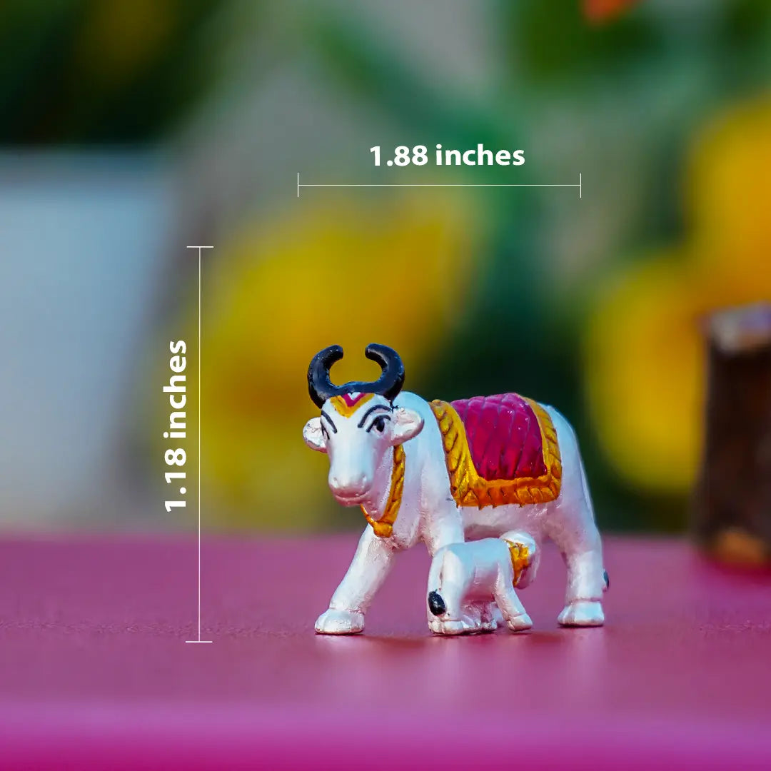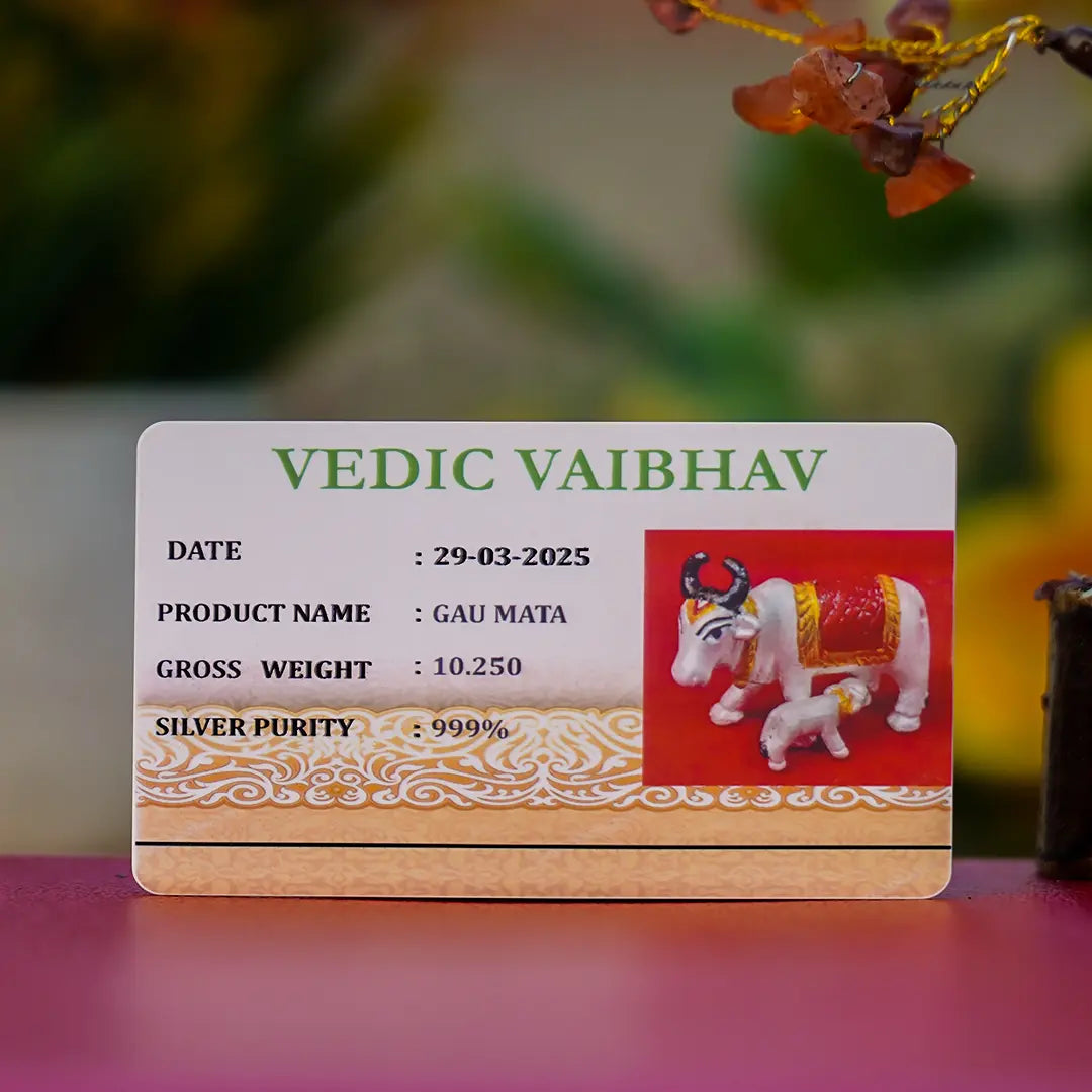 The Kamadhenu with Calf Silver Idol by Vedic Vaibhav is a sacred and elegant symbol of prosperity, purity, and maternal devotion. Expertly crafted from 99.9% pure silver and weighing 10.250 grams, this idol captures the divine essence of Kamadhenu—revered in Hindu tradition as the wish-fulfilling cow. It features intricate red and golden enamel accents that elevate its traditional charm, making it ideal for pooja rooms, vastu placement, festive gifting, and spiritual decor. Whether you're performing rituals or gifting blessings to loved ones, this idol embodies grace and goodwill. Every piece comes securely packaged and includes a BIS Hallmark Certificate, ensuring purity and authenticity. Key Features: Crafted with 99.9% pure silver, weighing 10.250 grams Includes BIS certification for guaranteed purity Features Kamadhenu with calf, a symbol of abundance and protection Accented with vibrant red and gold enamel for a traditional finish Ideal for home temples, vastu decor, and religious gifting Comes in premium packaging, ready for auspicious occasions