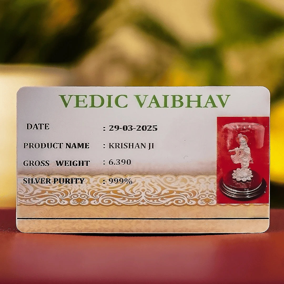 999 Silver Lord Krishna Idol with Protective Glass Cover Description:Elevate your spiritual space with this exquisite 999 Silver Lord Krishna Idol, a divine embodiment of grace, wisdom, and devotion. Meticulously crafted with pure 999 silver, this idol showcases Shri Krishna in his celestial form, playing the flute with a serene expression and adorned with a vibrant red peacock feather. Encased in a protective glass dome, this masterpiece preserves its elegance while adding a touch of divine serenity to any space. A perfect spiritual centerpiece for your home, office, or temple, this auspicious silver idol symbolizes love, guidance, and eternal blessings. It also makes for a meaningful gift for loved ones on special occasions such as festivals, weddings, and housewarming ceremonies. Features: ✔ 999 Pure Silver Craftsmanship✔ Certified Purity with Official Document✔ BIS Hallmarked for Guaranteed Authenticity ✔ Elegant glass dome for protection & aesthetic appeal✔ Intricate detailing with divine expressions✔ Sacred & timeless decor piece✔ Ideal for home altars, offices, and gifting Primary Color: Silver Pack Contains: 1 Sterling Silver Idol with Glass Cover Care Instructions: Avoid contact with harsh chemicals, perfumes, and lotions. Clean gently with a soft, dry cloth when needed. Sustainable: Yes Vibe: Sacred, Timeless & Elegant Type: Religious Figurine/Sculpture