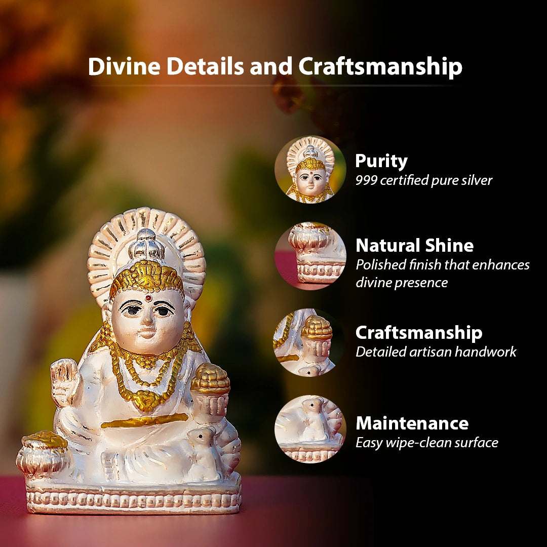 The Kuber Ji Silver Idol from Vedic Vaibhav is a powerful symbol of abundance and financial prosperity. Expertly handcrafted in 999 certified pure silver and weighing 50.480 grams, this idol showcases Lord Kuber seated with ornaments and a wealth pot, representing the guardian of treasure and prosperity. Finished with intricate golden accents and a lustrous polish, the idol embodies divine beauty and auspiciousness. Ideal for placing in home temples, safes, or as a sacred gift for business openings and wealth rituals, it comes with a certificate of purity and excellence. Made with 99.9% certified pure silver Gross weight: 50.480 grams Features Lord Kuber, the deity of wealth and abundance Hand-painted accents in gold and red for added elegance Perfect for wealth pooja, vastu placement, or festive gifting Comes with authenticity certificate from Vedic Vaibhav
