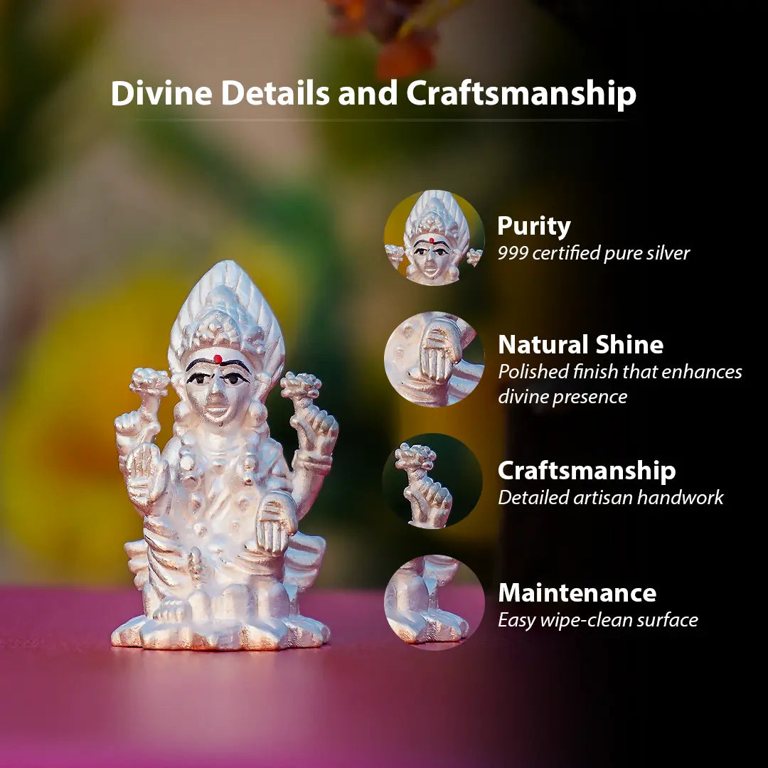 Invoke the blessings of wealth, abundance, and positivity with this graceful Maa Lakshmi Idol from Vedic Vaibhav. Made from 999 pure certified silver and weighing 13.280 grams, this miniature idol features exquisite craftsmanship and delicate facial detailing, capturing the serenity and grace of the Goddess of Fortune. Ideal for your home mandir, office desk, or festive gifting, this idol brings both aesthetic appeal and spiritual significance. Comes with a certificate of purity, making it a trusted and auspicious addition to your sacred collection. Crafted from 99.9% certified pure silver Gross weight: 13.280 grams Symbol of wealth, success, and divine grace Perfect for pooja rooms, gifting, and festivals Hand-painted accents for enhanced spiritual charm Comes with authenticity certificate from Vedic Vaibhav