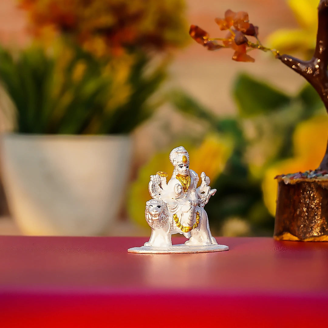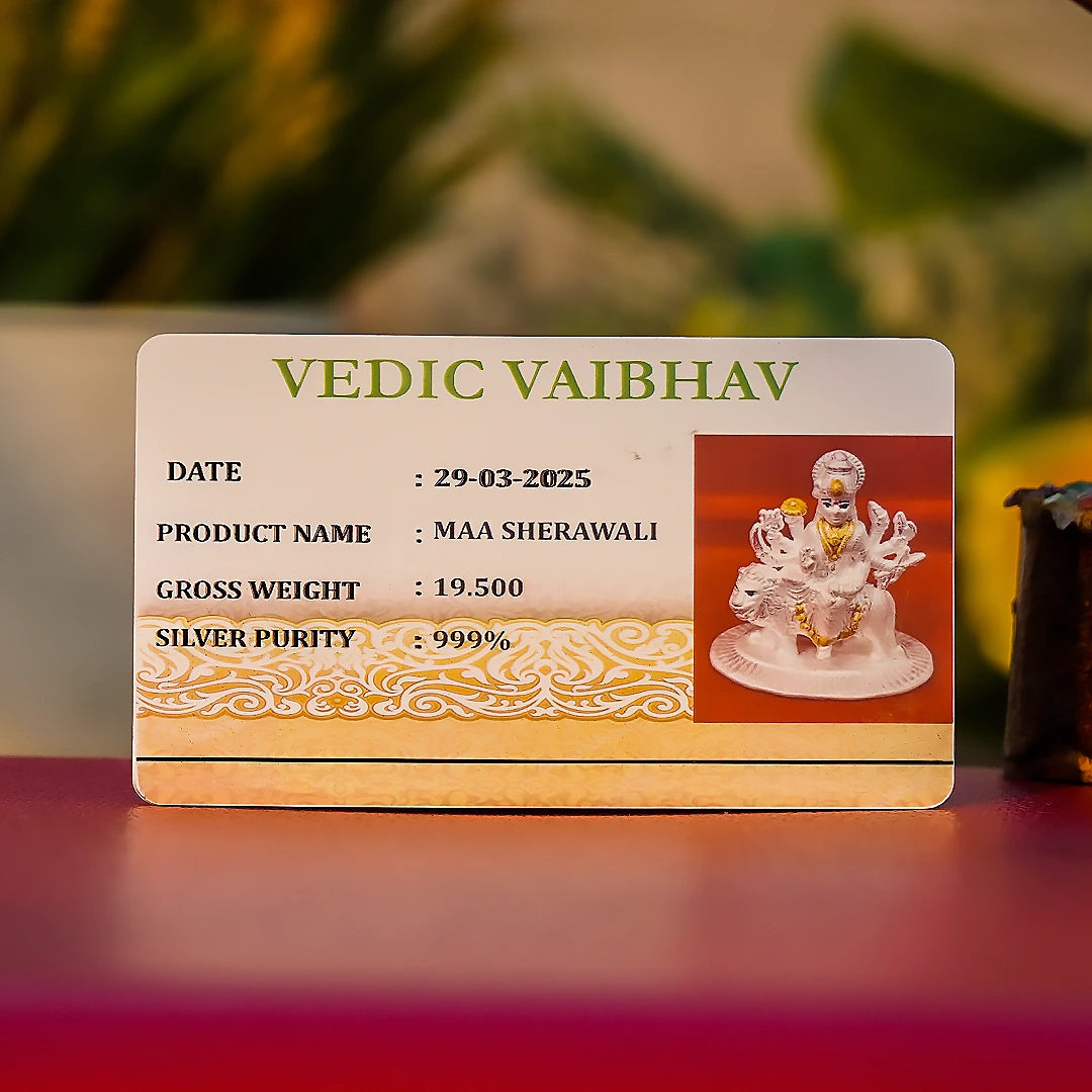Bring home divine blessings with this exquisitely crafted Maa Sherawali idol made from 999 pure certified silver. Representing strength, protection, and maternal grace, this idol showcases detailed artisan craftsmanship with a lustrous polished finish and gold-toned highlights. Ideal for festive gifting or daily worship, it combines traditional elegance with modern shine. A true symbol of devotion, purity, and fine artistry—perfect for pooja rooms, temples, or spiritual corners. ✨ Key Features: Purity: Made with 999 certified pure silver Design: Intricate hand-carved detailing with natural polish Shine: Golden accents enhance divine appeal Maintenance: Easy-to-clean, tarnish-resistant surface Perfect For: Gifting during Navratri, Diwali, or housewarming Comes with a BIS Hallmark Certificate .
