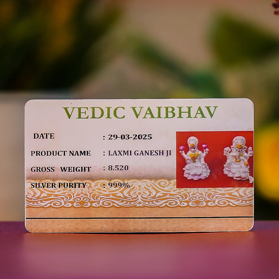 The Mini Laxmi Ganesh Ji Idol Set by Vedic Vaibhav is a delightful and sacred offering made from 999 pure certified silver, weighing 8.520 grams. Designed for small pooja altars, travel kits, or elegant Diwali gifting, this beautifully hand-painted set radiates devotion and charm. Despite its compact size—0.98 inches high and 0.70 inches wide—the detailing is precise, capturing the divine presence of Goddess Laxmi and Lord Ganesh. The idols come with a silver purity certificate and are easy to maintain, making them a perfect blend of spirituality and craftsmanship. Made with 999 certified pure silver Gross weight: 8.520 grams Compact size: 0.98” height × 0.70” width per idol Hand-painted accents in pink, gold, and white Ideal for Diwali, return gifts, or spiritual decor Comes with certificate of authenticity from Vedic Vaibhav