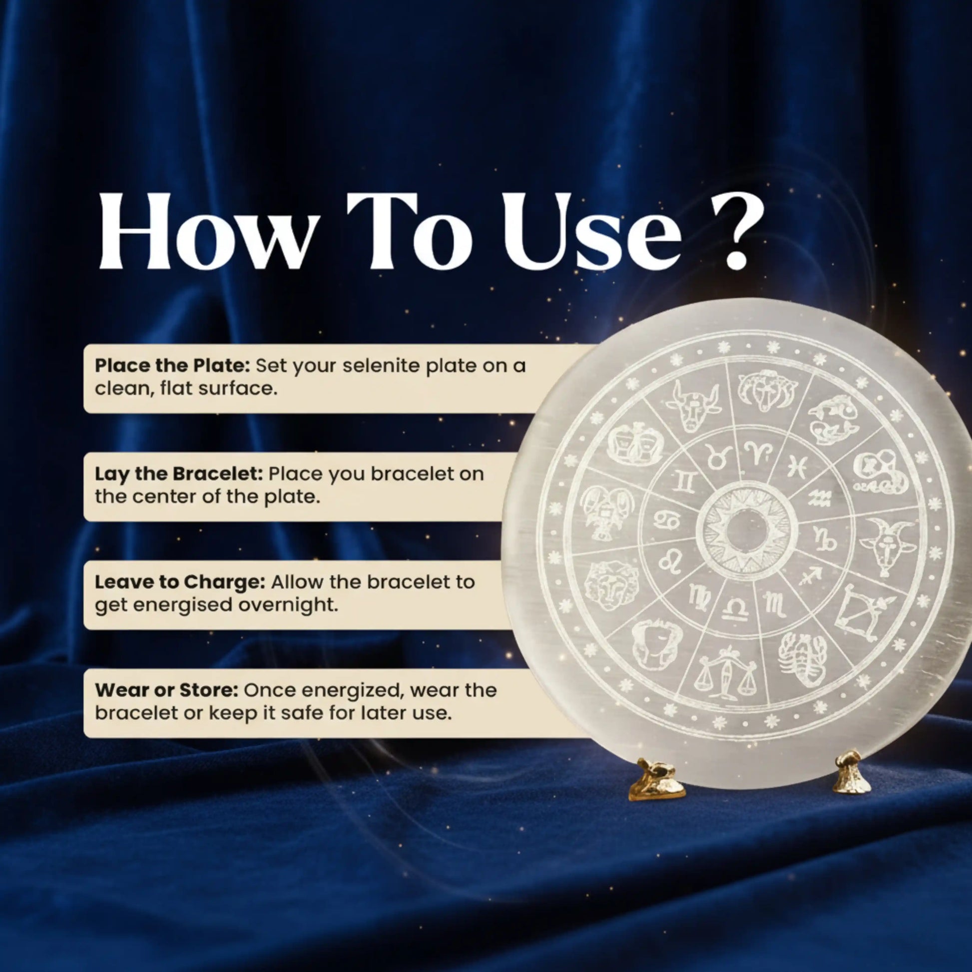 Elevate your crystal routine with this Natural Selenite Charging Plate—a luminous, zodiac-etched disc that cleanses stagnant energy and gently recharges your bracelets, tumbles, and small tools. Selenite’s self-cleansing nature keeps your pieces clear, restores their vibrancy, and creates a soft protective aura around your space—perfect for a nightstand, altar, or desk. What it does Purifies & recharges crystals and jewelry Activates chakras and uplifts meditation spaces Creates a protective field to keep vibes calm and clear How to use Place the plate on a flat, clean surface. Lay your bracelet or crystals in the center. Leave to charge (ideally overnight). Wear or store your freshly energized pieces. Specs & care Round plate, approx. 8.3 cm diameter (natural stone; slight variations may occur) Carved zodiac design; smooth satin finish Keep dry; do not immerse in water (selenite is a soft, soluble mineral). Great for Daily cleansing of crystal bracelets Altars, bedside tables, and work desks Thoughtful, glow-up gift for crystal lovers