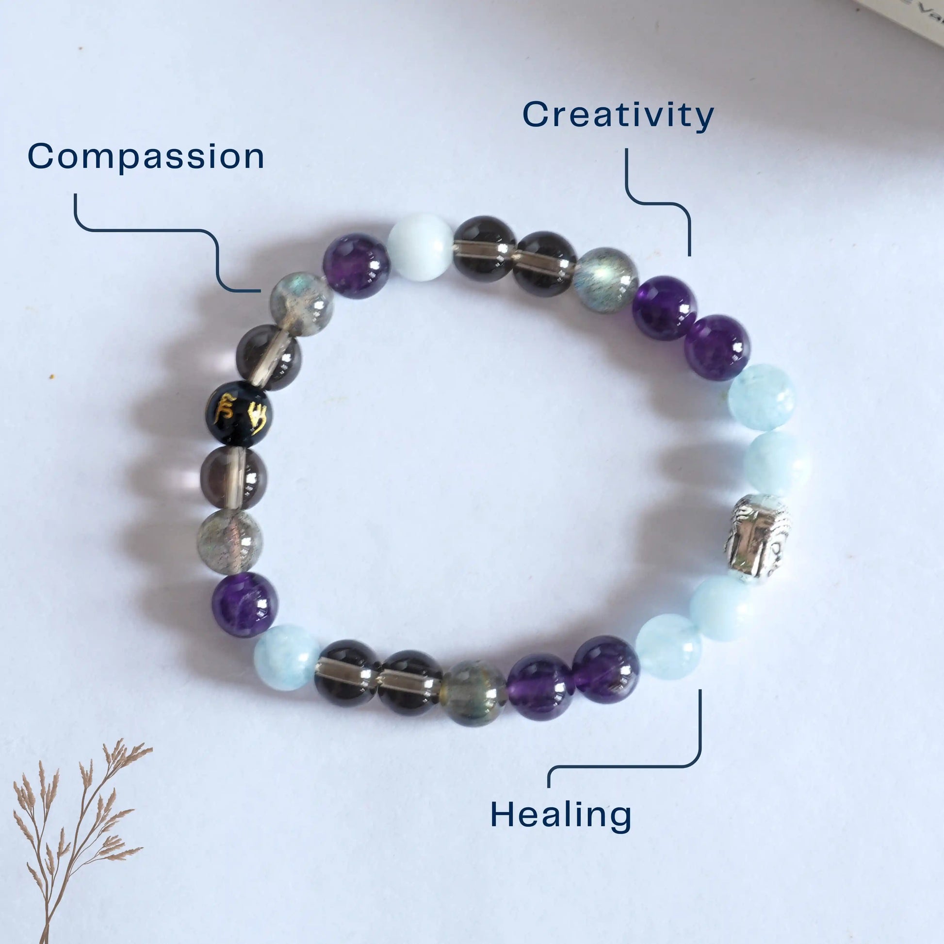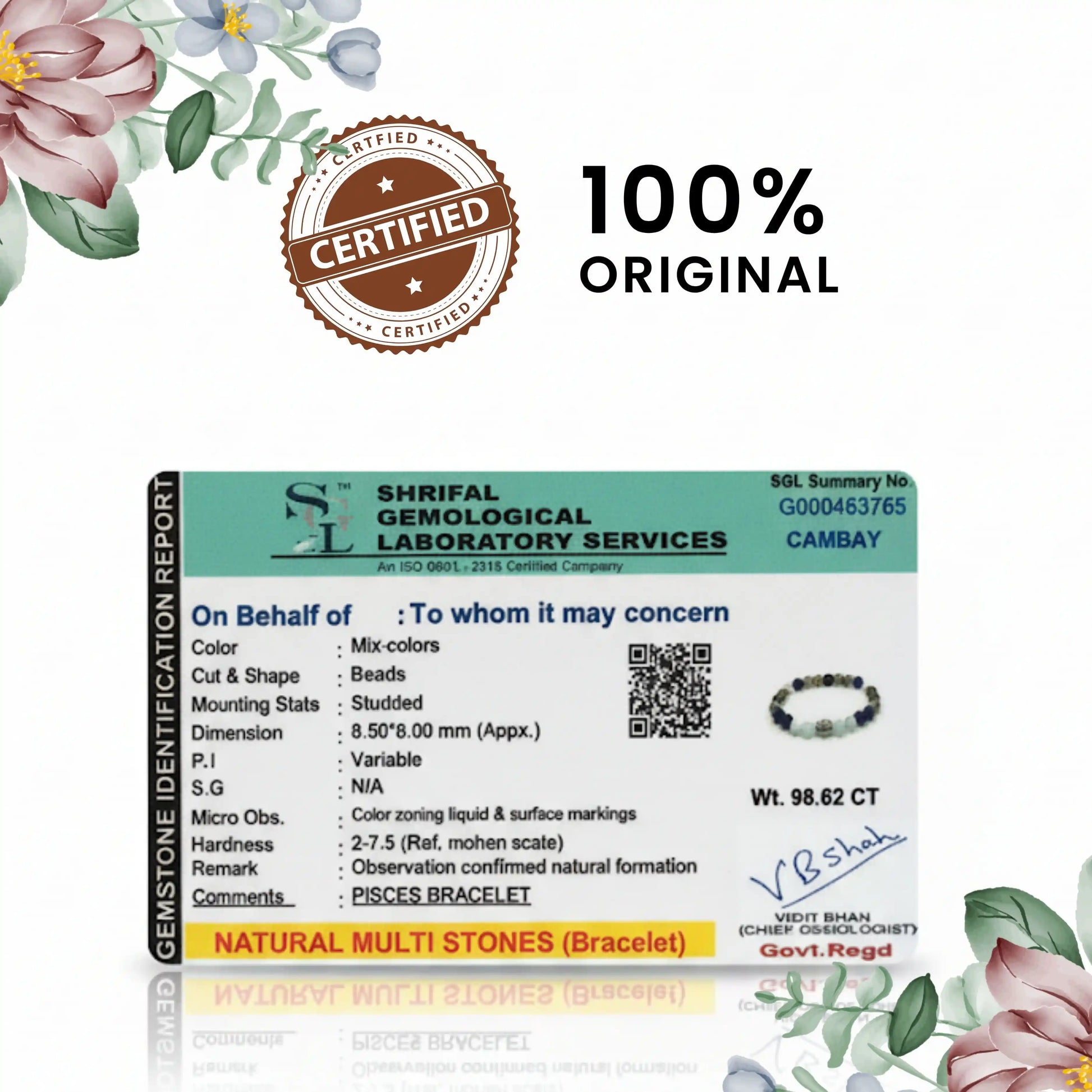 Pisces Natural Multi-Stone Bracelet Hand-strung with a calming blend of natural gemstones, this Pisces bracelet is designed to channel the sign’s most cherished traits—compassion, imagination, and gentle self-healing. Cool purples and oceanic blues meet smoky neutrals for a soothing, wearable talisman you can pair with anything. Gemstones & traditional meanings Aquamarine / Light blue beads – soothing clarity & emotional healing Amethyst / Purple beads – intuition, creativity, calm focus Labradorite / Iridescent gray – transformation, inner strength Smoky Quartz / Translucent brown – grounding, protection White bead & mantra bead + silver Buddha charm – a mindful finishing touch Certified natural stones Comes with a Shrifal Gemological Laboratory Services identification report Report notes: Natural Multi Stones (Bracelet); beads; mix colors; hardness ~2–7.5 (Mohs); approx. bead size 8.50 × 8.00 mm; total weight ~98.62 ct Design details Smooth round beads on a durable stretch cord for easy on/off Balanced color flow for an elegant, everyday stackable look Comfort-fit, unisex style Why you’ll love it A thoughtful gift for Pisces (Feb 19–Mar 20) or anyone drawn to serene, ocean-inspired tones Certified authenticity for peace of mind A beautiful reminder to lead with heart, spark creativity, and nurture your well-being Care Keep dry; avoid chemicals and impact. Wipe with a soft cloth and store separately. In the box Pisces natural multi-stone bracelet Original SGL certification card