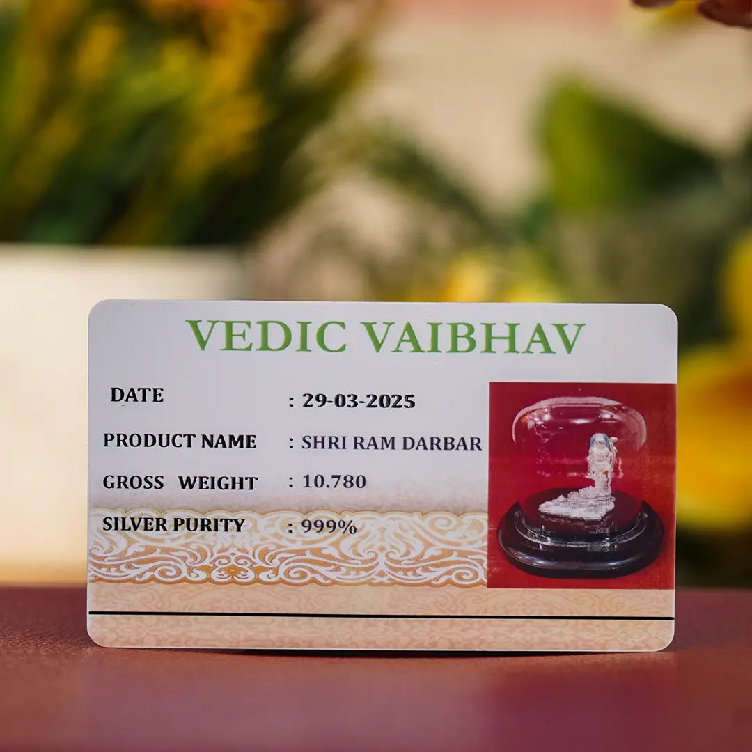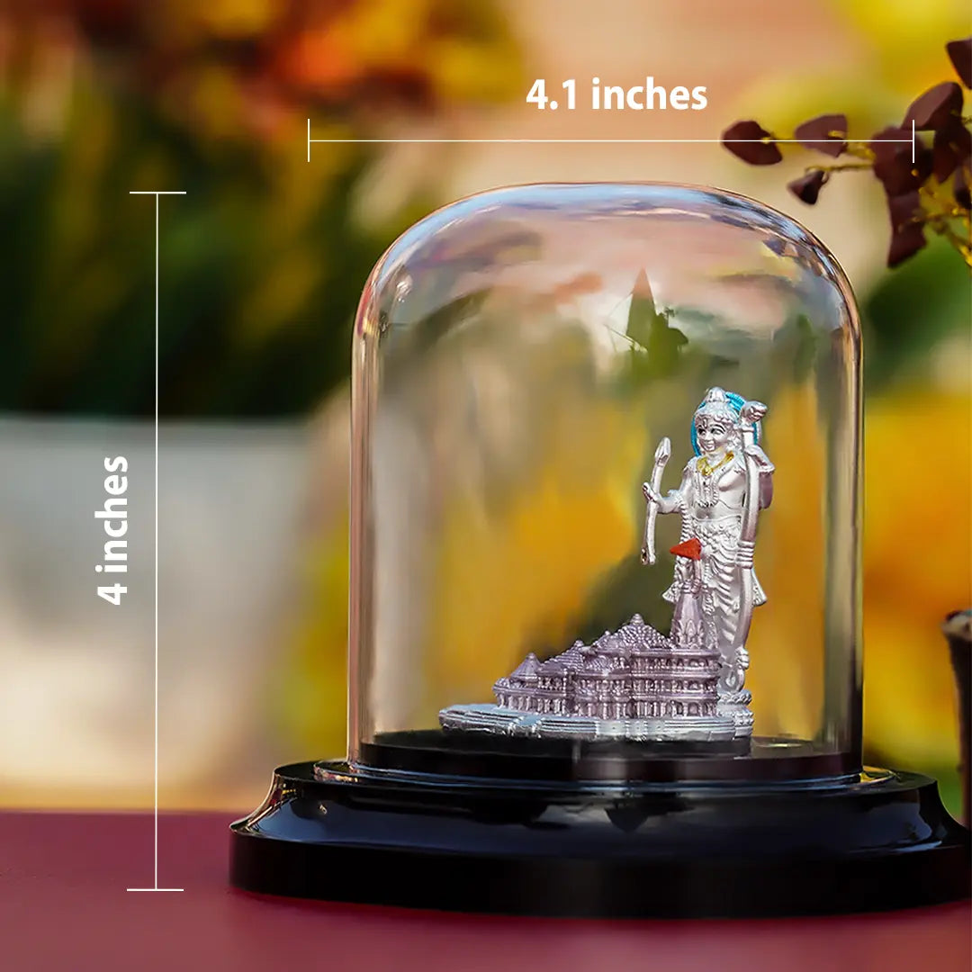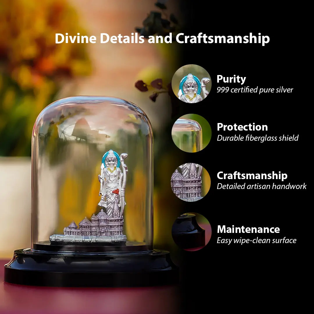Bring home the divine presence of Lord Ram with this Shri Ram Silver Idol with Ram Mandir, a beautifully detailed piece handcrafted from 99.9% pure silver. The idol stands majestically in front of a miniature replica of the sacred Ram Mandir, all encased within a durable fiberglass dome for elegance and protection. Ideal for devotional spaces or premium gifting, this piece comes with a BIS Hallmarked Certificate, guaranteeing purity and authenticity. ✔ Made from 999 certified pure silver✔ Features Lord Ram with Ram Mandir base design✔ Comes with a BIS Hallmarked Certificate✔ Protected by a clear fiberglass dome✔ Gross Weight: 10.780 grams✔ Date of Manufacture: 29-03-2025✔ Hand-painted details and expert artisan craftsmanship✔ Easy to clean and maintain – just wipe with a soft cloth✔ Perfect for pooja, décor, or auspicious gifting