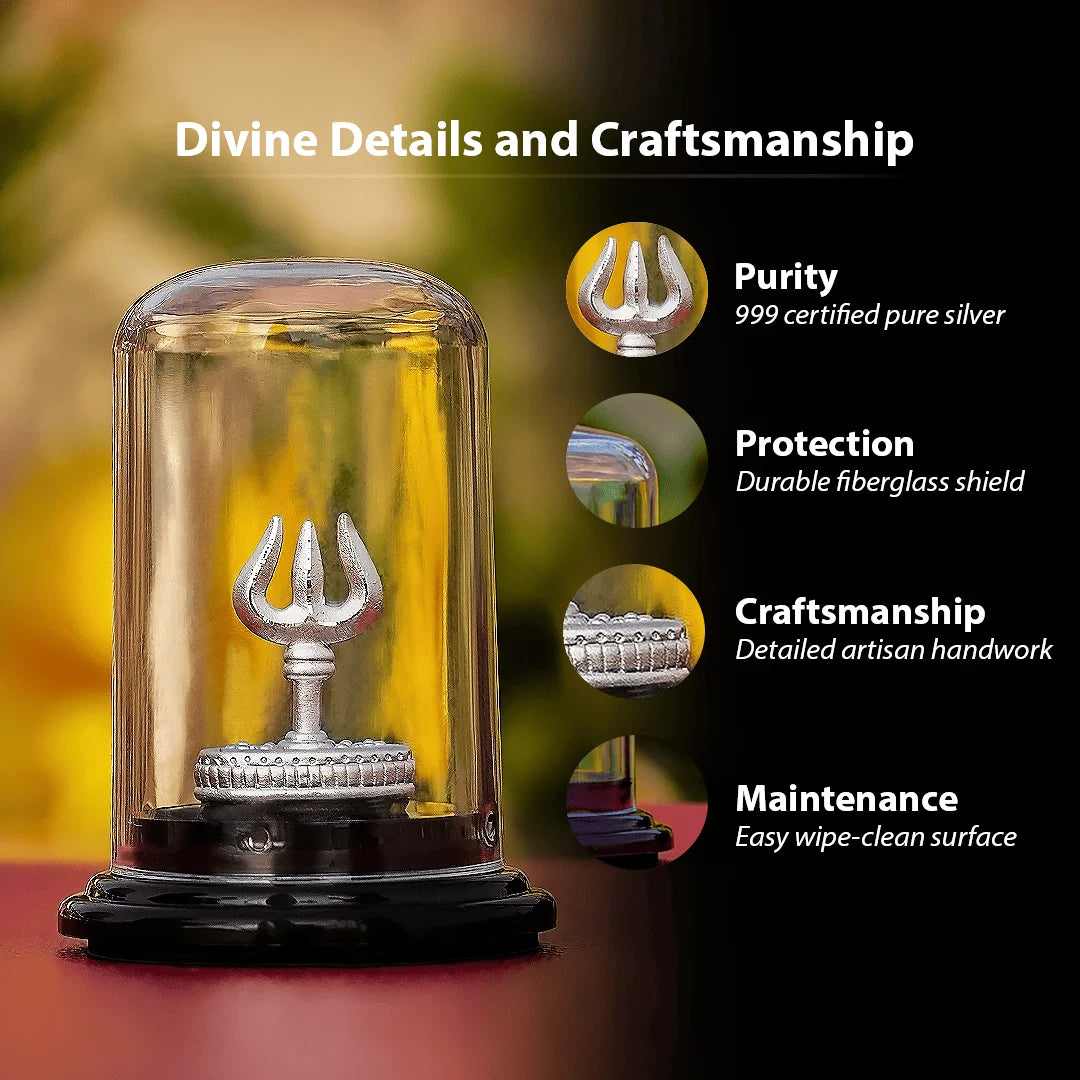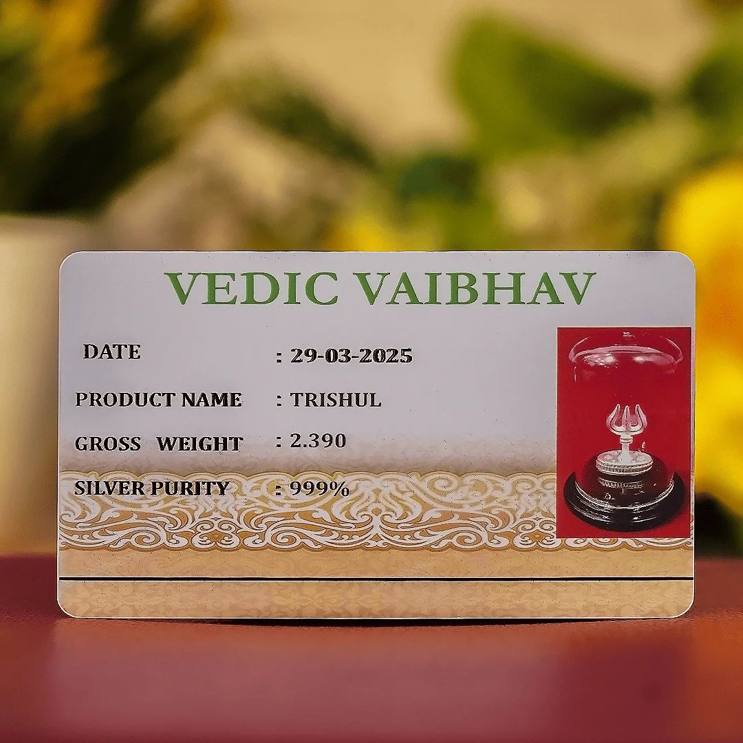 The Silver Shiv Trishul - 999 Pure Silver is a spiritually significant artifact, symbolizing Lord Shiva’s supreme power, protection, and destruction of negativity. This handcrafted Trishul, made from 99.9% pure silver, is perfect for devotees, home temples, puja altars, and gifting on auspicious occasions. ✨ Features: 🪙 999 Pure Silver Craftsmanship🧾 Certified Purity with Official Document💎 BIS Hallmarked for Guaranteed Authenticity ✅ Handcrafted with detailed silverwork✅ Symbolic Representation: Three prongs (tridents) representing the Trimurti: Brahma (Creation), Vishnu (Preservation), and Mahesh (Destruction). Optionally available with a damaru (small drum), signifying cosmic energy. Engraved Sanskrit shlokas (customization available).✅ Brings Strength, Protection, and Spiritual Balance✅ Ideal for Home Temples, Meditation Spaces, and Religious Ceremonies✅ Perfect Gift for Mahashivratri, Housewarming, and Devotees of Lord Shiva ✨ Placement & Vastu Tips: Place in the north or northeast direction for maximum spiritual benefits. Can be kept in temples, offices, or homes for divine protection. Avoid placing on the floor or in impure spaces. ✨ Care Instructions: Clean with a soft cloth or silver polish for a long-lasting shine. Avoid exposure to water, moisture, and chemicals.