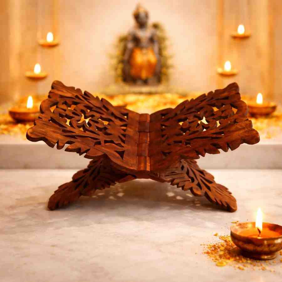 The Wooden Book Stand Rail is a sturdy and elegant stand designed to hold books, scriptures, and reading materials comfortably. Crafted from quality wood, it offers stable support and a traditional look, making it ideal for reading religious texts, study books, or keeping scriptures during daily pooja and learning sessions.